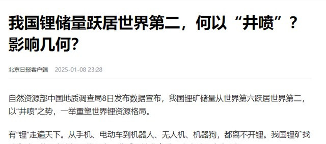 北京日报《我国锂储量跃居世界第二,何以“井喷”?影响几何?》2025-01-08