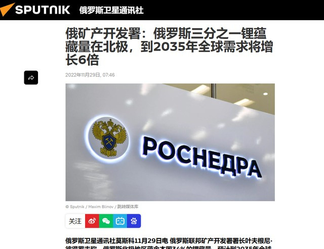 俄罗斯卫星通讯社《俄矿产开发署:俄罗斯三分之一锂蕴藏量在北极,到2035年全球需求将增长6倍》2022-11-29